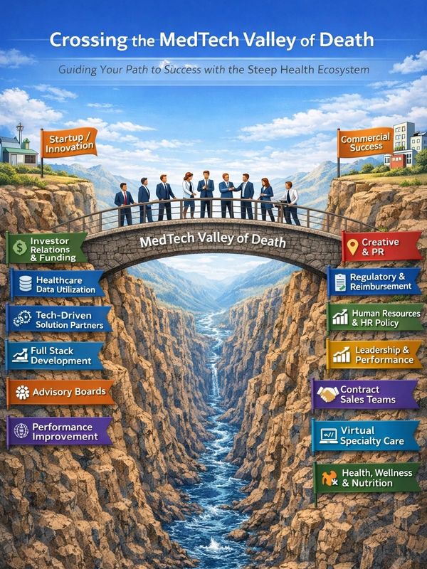 Together, this integrated ecosystem enables organizations to rapidly access the capabilities needed to navigate complexity, accelerate commercialization, and successfully cross the MedTech Valley of Death. Whether addressing capital strategy, market access, or scalable growth infrastructure, our network is designed to extend your team and deliver the expertise required at every stage of the journey.